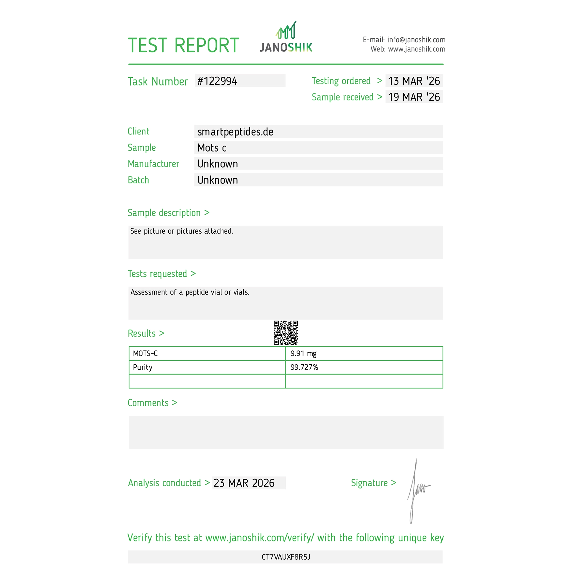 MOTS-c kaufen Sie bei Smart Peptides in zertifizierter Forschungsqualität mit mindestens 98% Reinheit. MOTS-c (Mitochondrial Open Reading Frame of the Twelve S rRNA Type-c) ist ein mitochondrial kodiertes Peptid aus 16 Aminosäuren, das 2015 erstmals von Professor Changhan David Lee beschrieben wurde. Es ist das erste bekannte mitochondriale Peptid, das als Signalmolekül den Zellkern erreicht und dort aktiv die Genexpression reguliert. In der